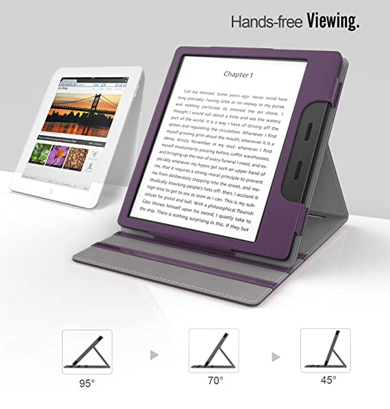 Hay fundas para Kindle (en la mayoría de sus versiones) que incorporan una suerte de “tapa plegable” que nos permite leer desde una posición de 45° a 95° desde una superficie plana, como una mesa. Hay muchas fundas para las tabletas (iPad, por ejemplo) que traen también esta opción. Tienen también como ventaja que cuentan con un sistema de imanes que permiten despertar o suspender el Kindle simplemente abriendo o cerrando la tapa.